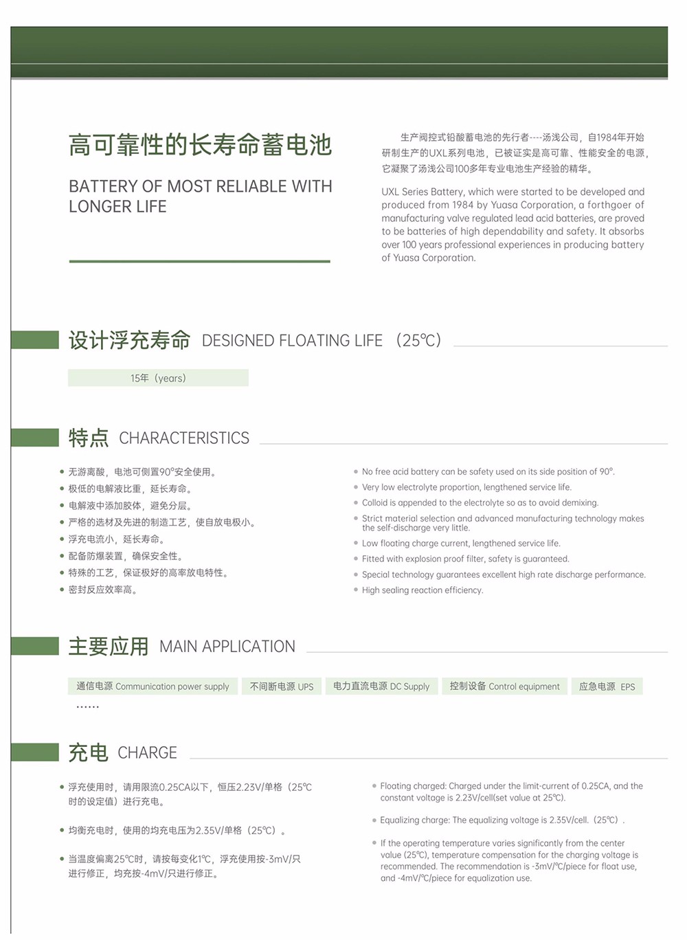 生产阀控式铅酸蓄电池的先行者----汤浅公司,自1984年开始研制生产的UXL系列电池,已被证实是高可靠、性能安全的电源,它凝聚了汤浅公司100多年专业电池生产经验的精华。
